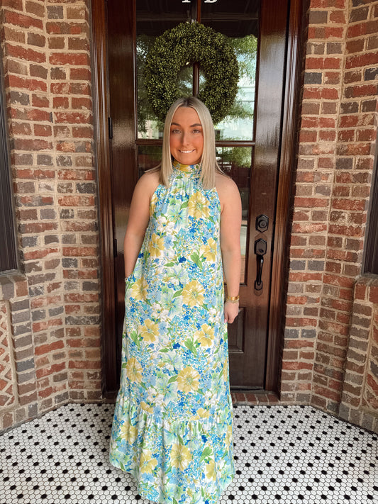 Oceanside Floral Halter Mock Neck Maxi Dress