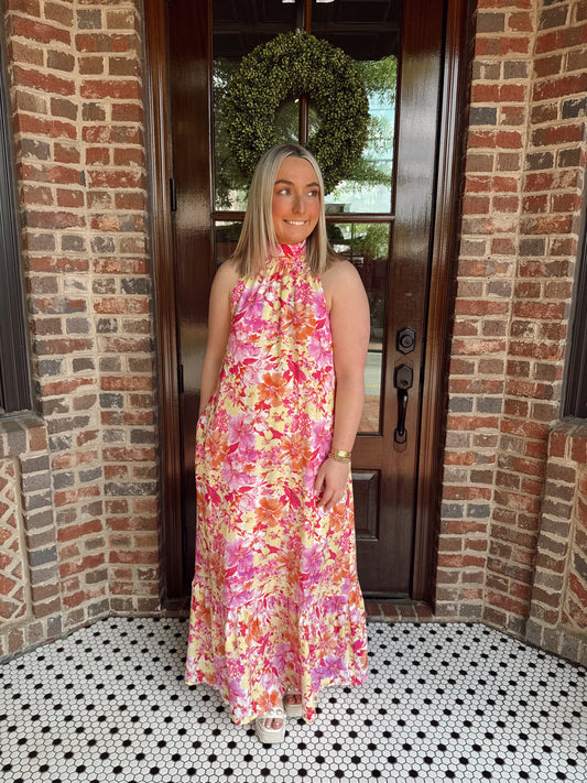 Sunset Floral Halter Mock Neck Maxi Dress