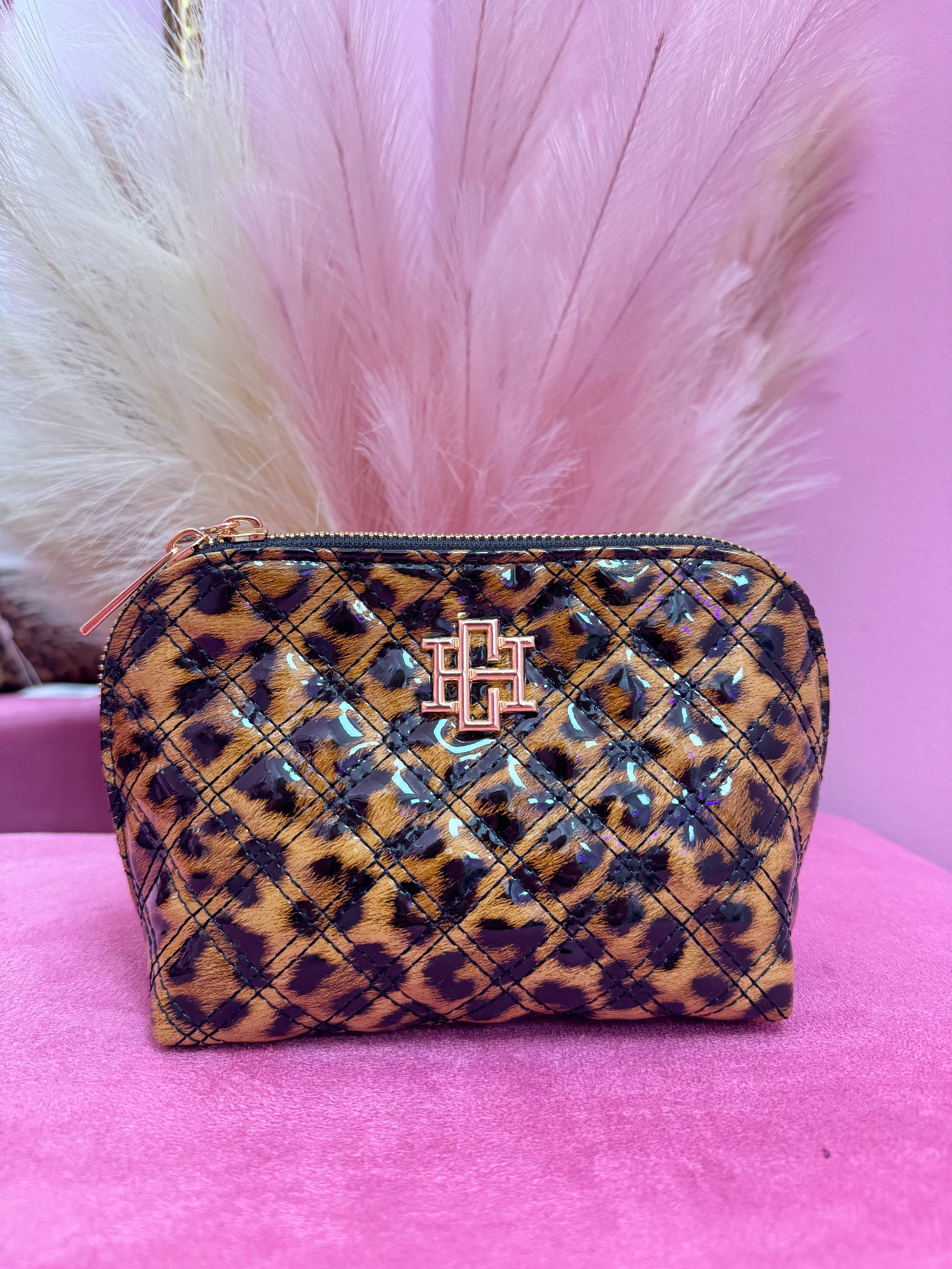 This gorgeous vegan patent leather pouch is part of our makeup and travel collection. It has a sleek and compact body style with a quilted fabric design. The elongated zipper provides easy access, making it perfect for organizing makeup, toiletries, and hair accessories. The spacious interior is lined with vibrant hot pink, wipeable nylon.Β It's the perfect size pouch to keep in your everyday tote for chargers, cosmetics, and so much more.