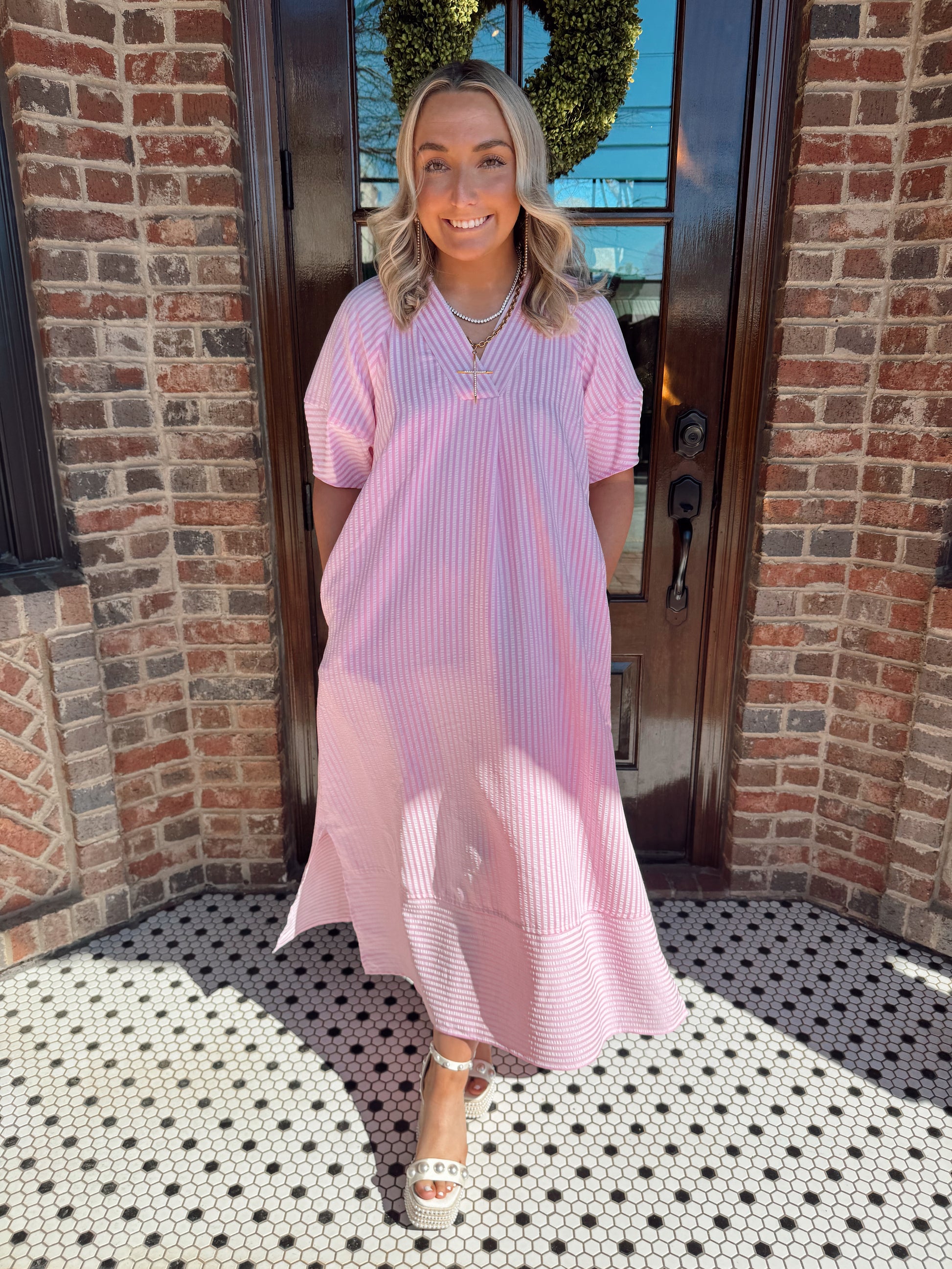 Stripe pattern textured pullover midi dress features raglan lantern sleeves and slit side hems. Pockets at side. Lined. Woven. Non-sheer. Lightweight.
